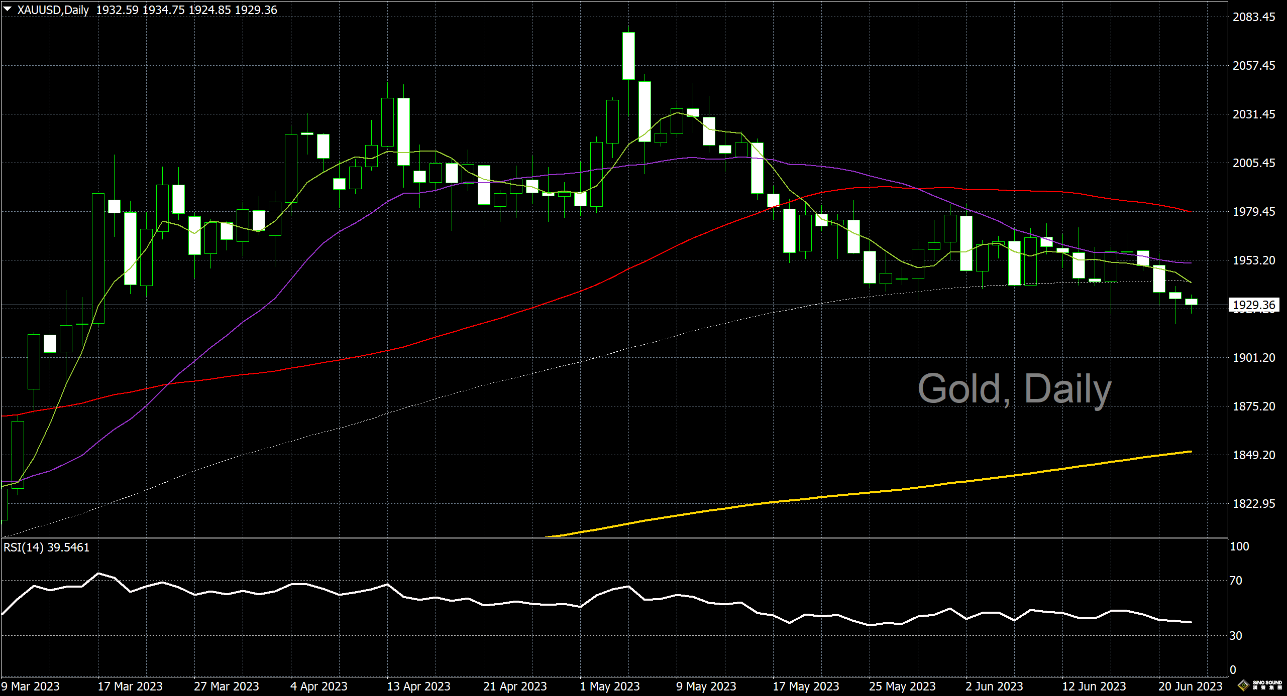 受鲍威尔鹰派论调影响,黄金于近期低位剧烈波,日内现货金价触及1919.34美元/盎司,创3月16日以来新低,最后跌幅缩减,收报1932.54美元/盎司。周四黄金走势依然低迷不振,英国央行意外加息50个基点,将利率调高至5.0%,创2008年9月以来最高水平,消息公布后英镑兑美元短线冲高后回落,对黄金并无带来太大影响。截稿前,现货金价于1930.00美元/盎司下方交投,预计短期将维持下行趋势不变。