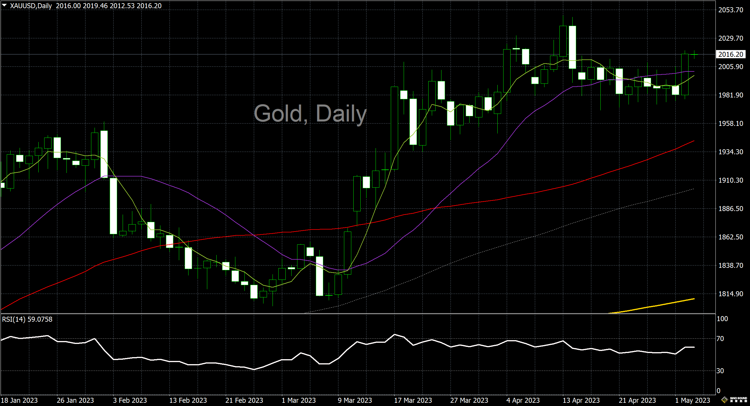 週二,美元指數觸及102.40附近的3周高位後走勢逆轉,最後結束3連漲勢頭收於102.00下方。在第一共和銀行倒閉後,投資者對金融危機的擔憂再次浮出水面,區域性銀股遭到拋售,點燃了市場的避險情緒,10年期美債收益率跌超4%,導致美元失掉強勢,黃金多頭乘勢反攻,並於美市時段迎來爆發,盤中現貨金價飆漲至2018.97美元/盎司,創逾兩周新高,最後收於2016.47美元/盎司,錄得1.7%漲幅。週三黃金高位橫行,行情變化不大。截稿前,現貨金價於2016.20美元/盎司附近徘徊。美聯儲利率決議在即,加之日內還有4月ADP就業報告和ISM服務業PMI等重要數據公佈,市場觀望氣氛濃烈。