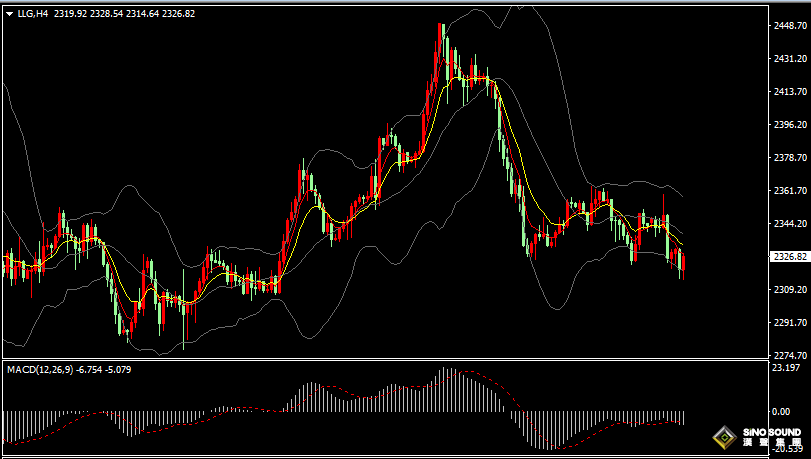 金價4小時圖看,金價布林帶三軌同步下移,金價持續在布林下軌附近振盪運行;短期均線EMA5和EMA10維持空頭向下,MACD指標負動能柱有所增加,RSI指標在40位置附近徘徊。晚間短線操作建議,先看金價在2315-2332區間振盪整理,如突破該區間時,上行目標看2340-2346,下行目標看2307-2300。