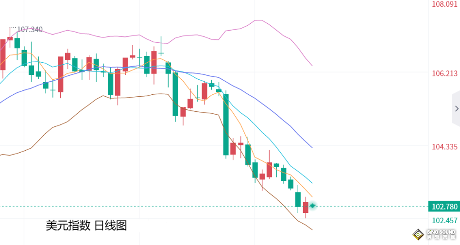 整體來看,美元指數日圖仍處於布林帶下行通道和短期均線下方保持回落趨勢,周圖及月圖也亦是如此,暗示走勢空頭佔據主導優勢,那麼在重回短期均線上方前,仍將延續走低,並對金價產生支撐;