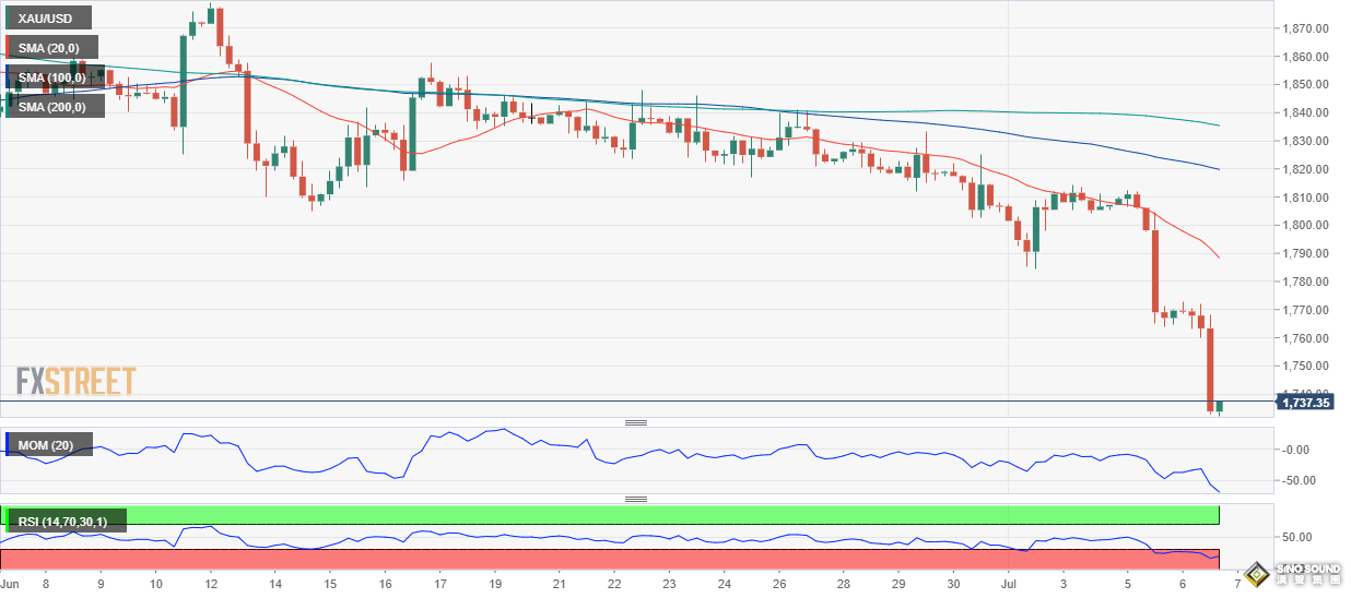 周四(7月7日)亞市盤中,現貨黃金小幅反彈,現報1740美元/盎司附近。FXStreet首席分析師分析師Valeria Bednarik最新撰文,對金價技術前景進行分析。