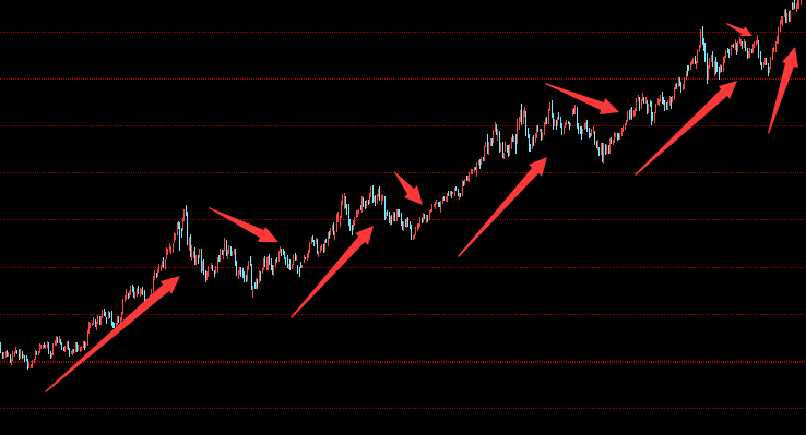 有了上面的我們說的內容,再來談這個回調和反彈就有意義了。回調,是指市場走得太遠了,需要回來調整一下。回調主要用在上升趨勢中,圖1就是一個上升趨勢,圖中每一個向下的箭頭代表的都是一次回調。
